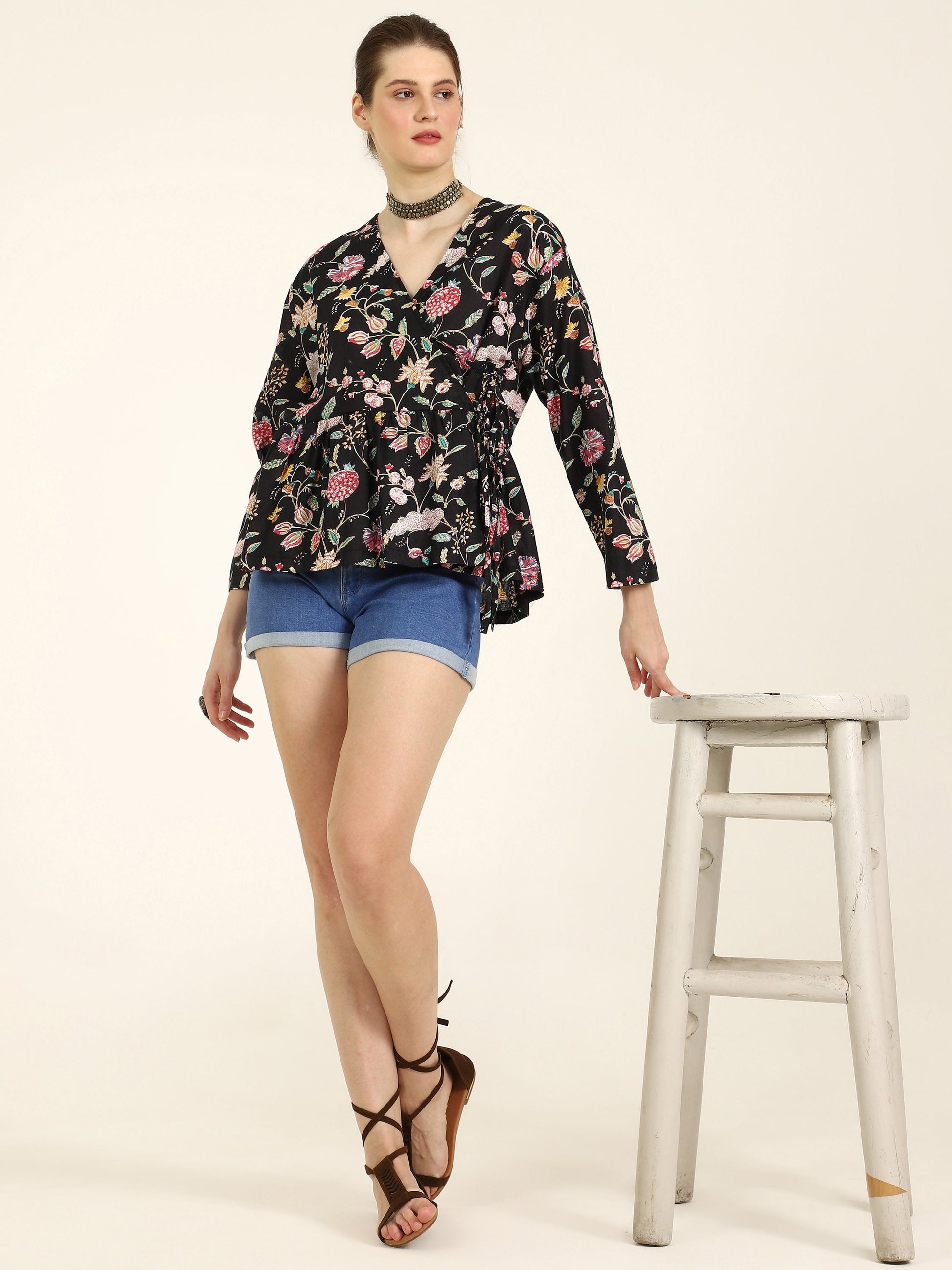 100% Cotton Hand block Printed. An angarkha-style top featuring a relaxed silhouette and side tie-ups. The intricate floral print stands out against a deep base, giving it a modern yet artisanal charm.