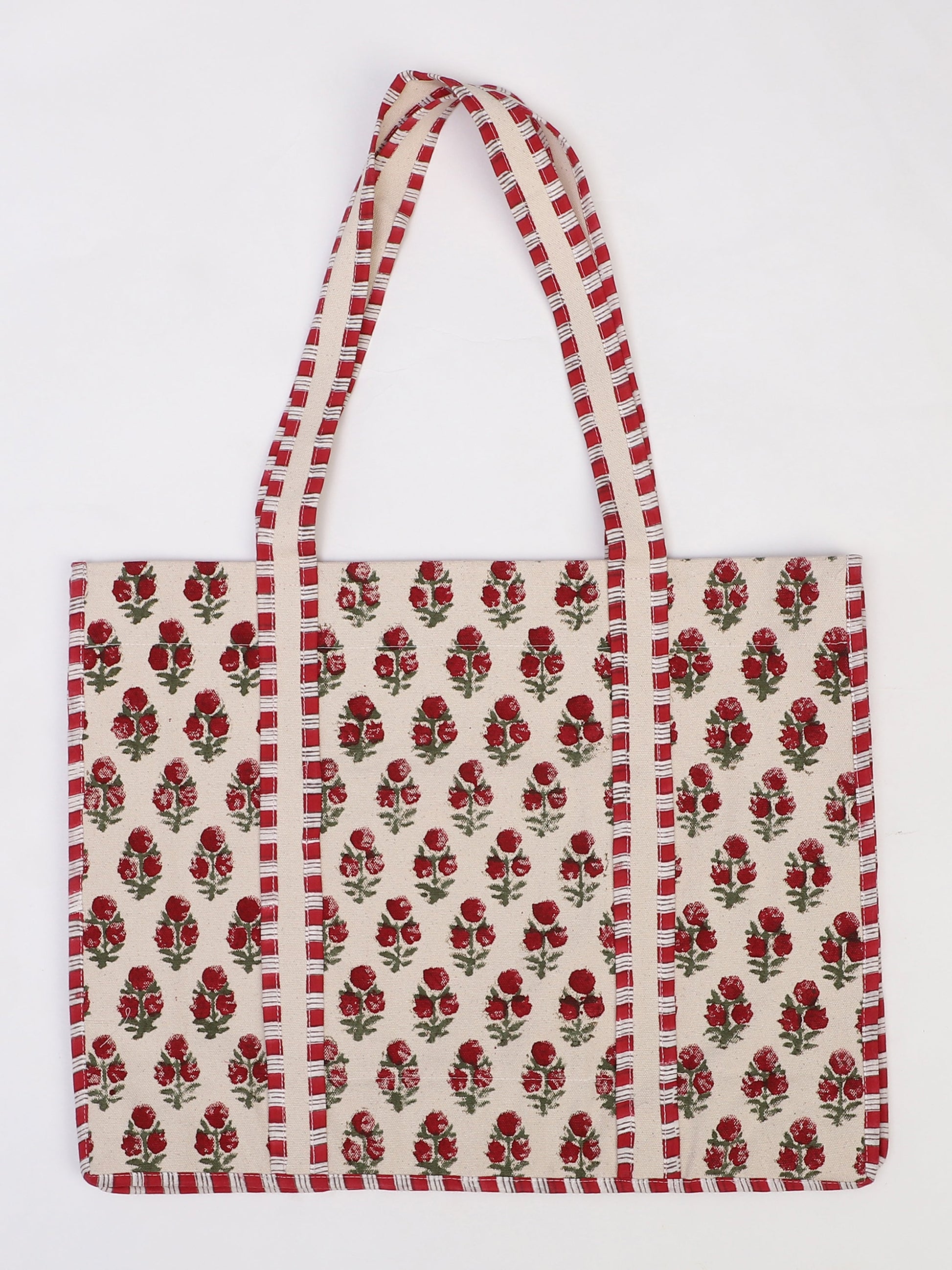 Crafted in 100% cotton canvas, hand block-printed by artisans in Rajasthan. The tote features sturdy striped handles and borders for added strength and structure. The Kesariya Tote brings together the spirit of Indian festivity and everyday elegance. One side features a bold marigold motif — vibrant yet soothing — while the reverse showcases a delicate all-over buti print. The striped orange-green edging adds a cheerful finish.