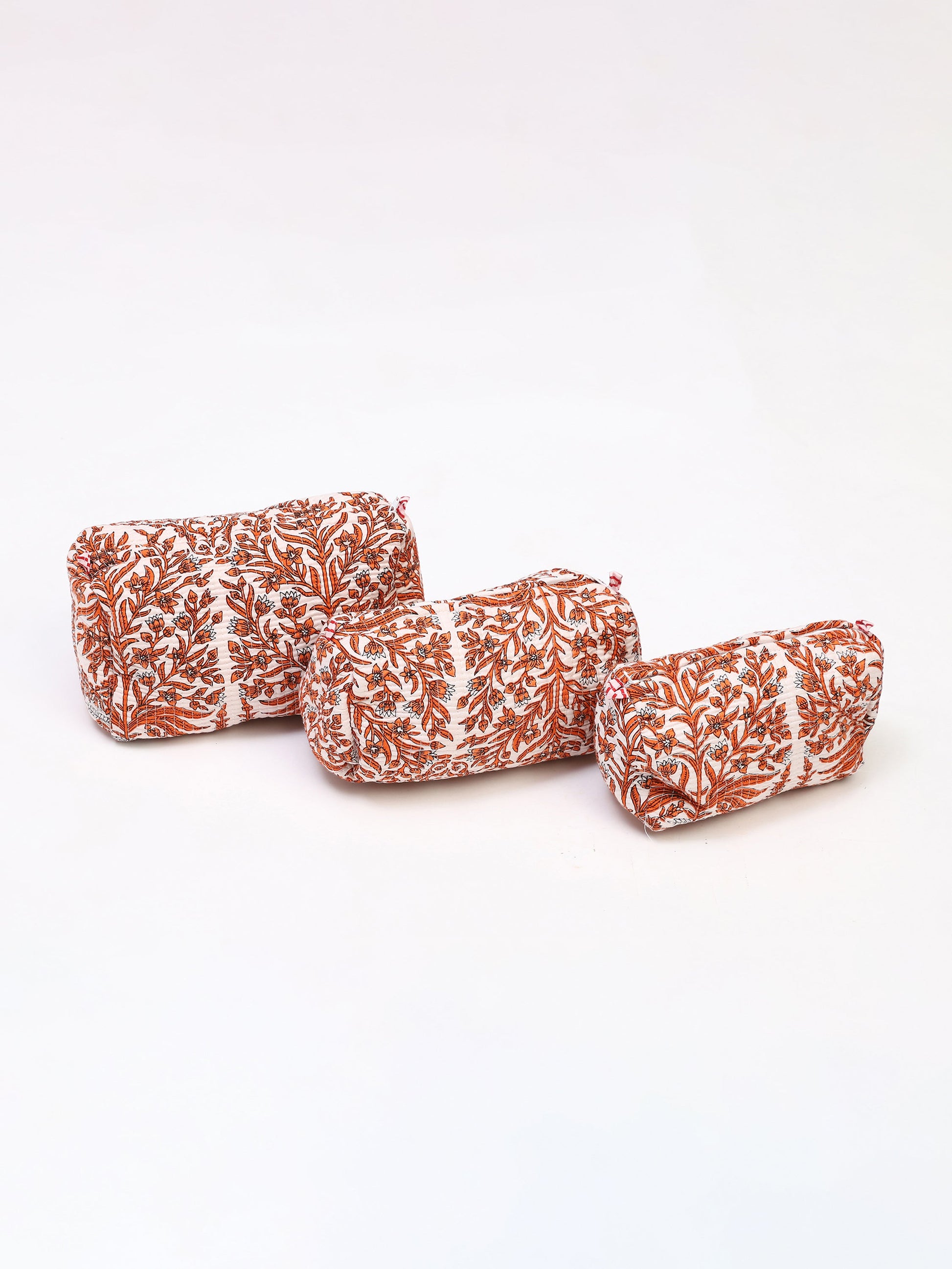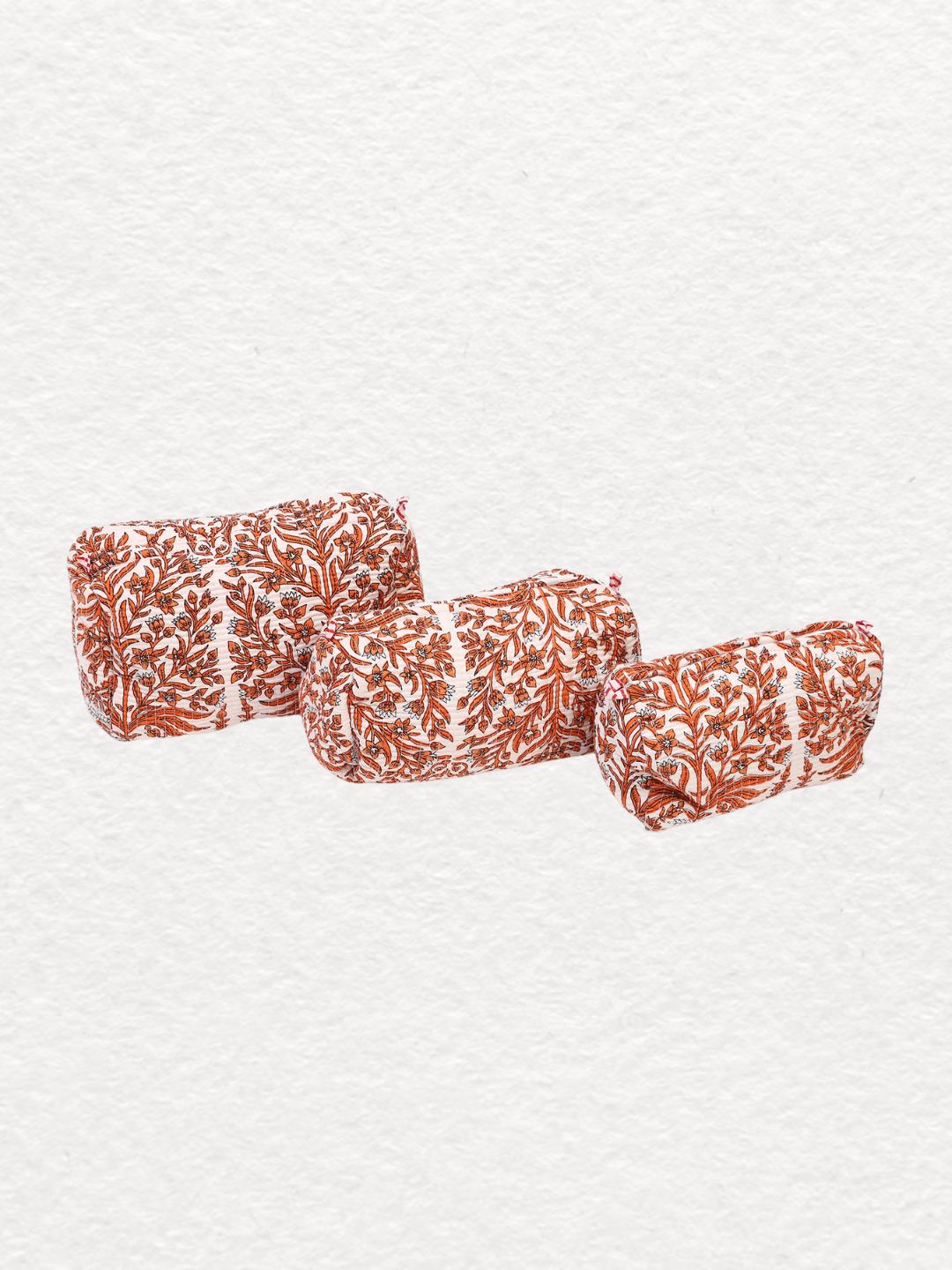 Made from hand block-printed quilted cotton, these pouches are soft yet structured. Each one is lined with cotton and finished with a durable zipper for lasting use. The Tamarai Utility Pouches feature intricate hand-printed florals in terracotta and sepia tones on a cream base — a palette inspired by nature and earthy calm. The quilting adds gentle texture, while the handcrafted finish makes each piece one of a kind.