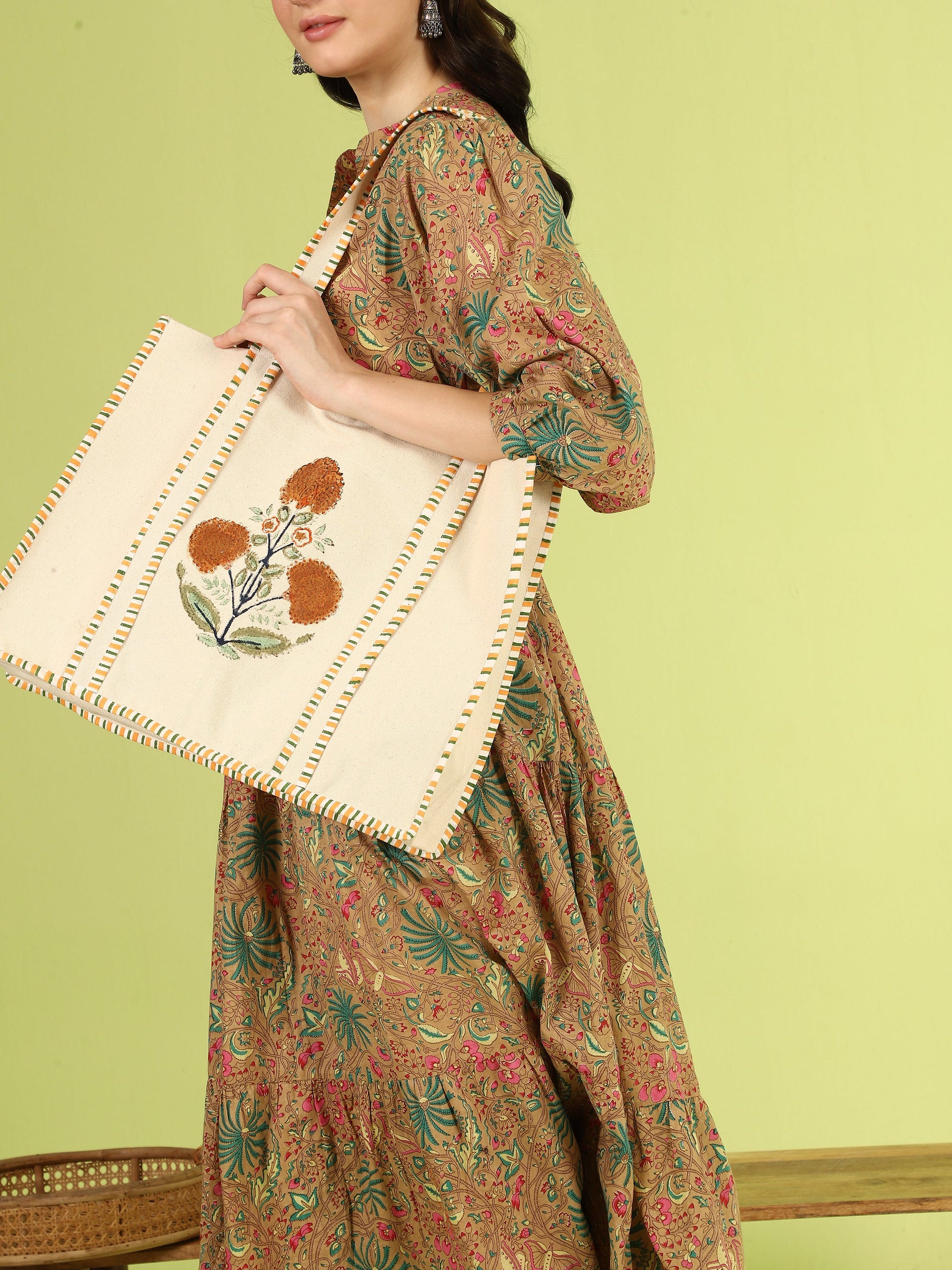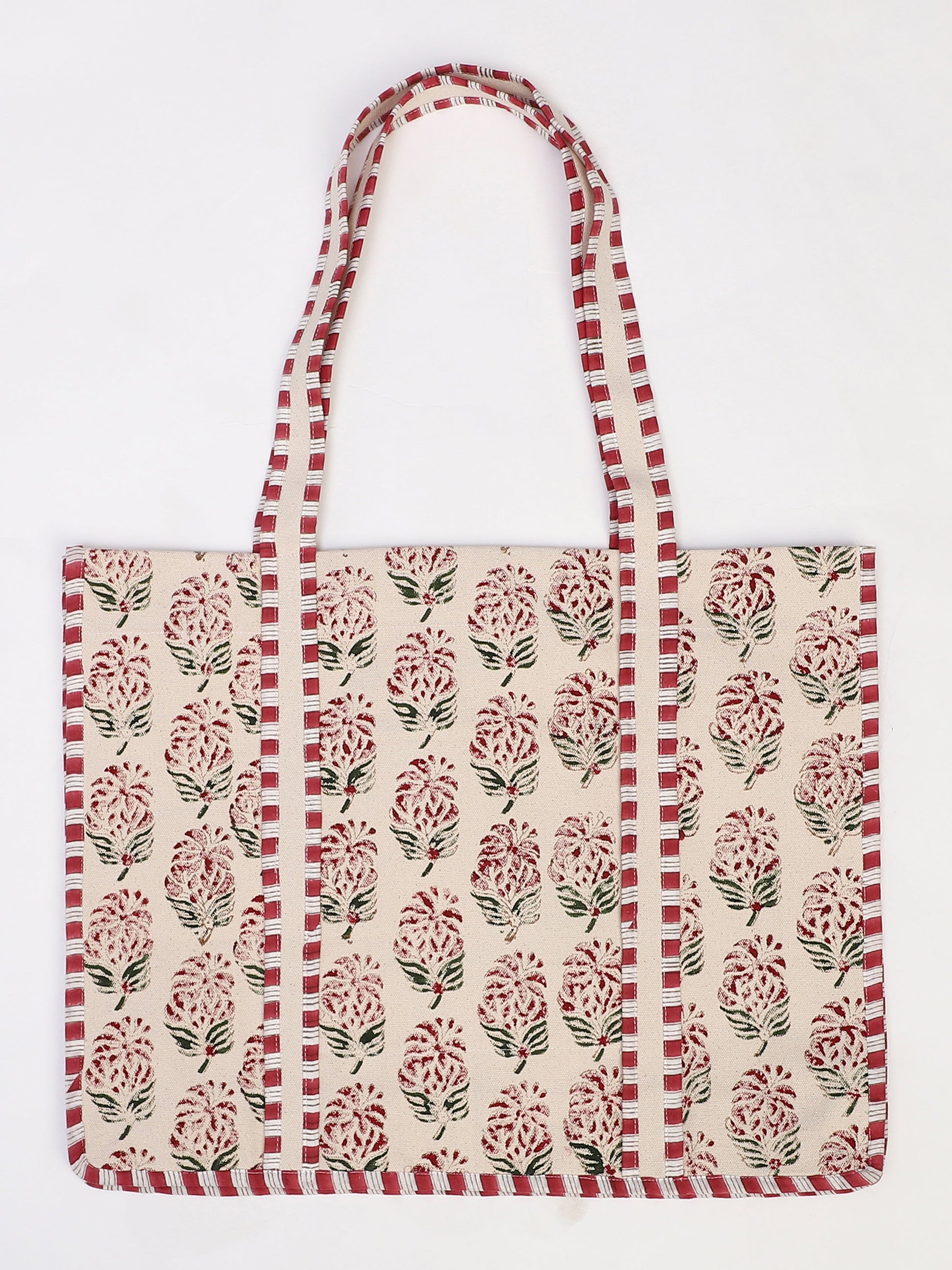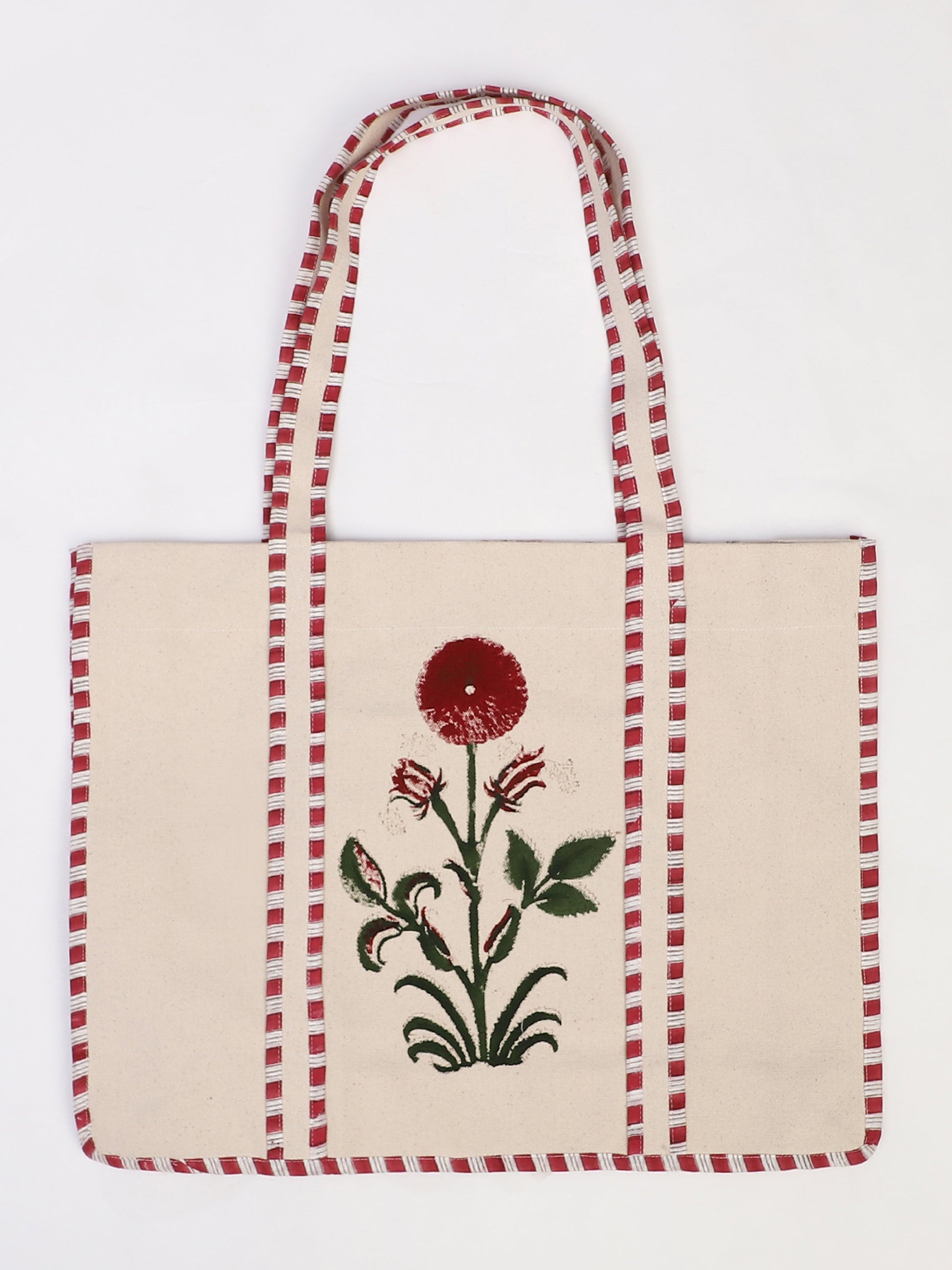 Made from 100% cotton canvas, hand block-printed by artisans in Rajasthan. Reinforced with signature striped borders and sturdy handles for everyday strength. The Vaari Tote features a dual-sided floral design — one side with a bold, single bloom and the other adorned in an all-over buti pattern. The deep maroon and green motifs pop beautifully against the natural canvas base, framed with red striped detailing for a subtle contrast.
