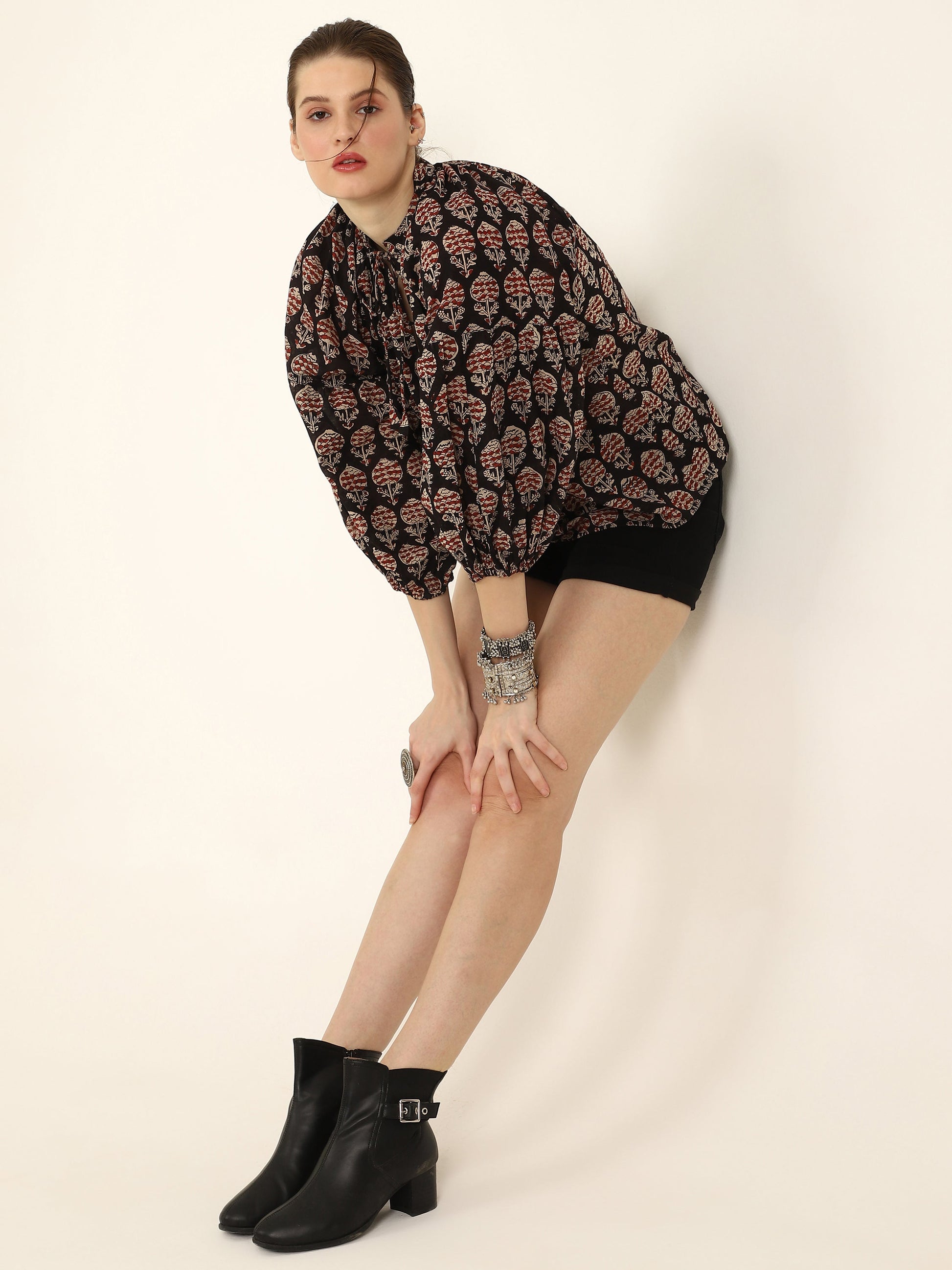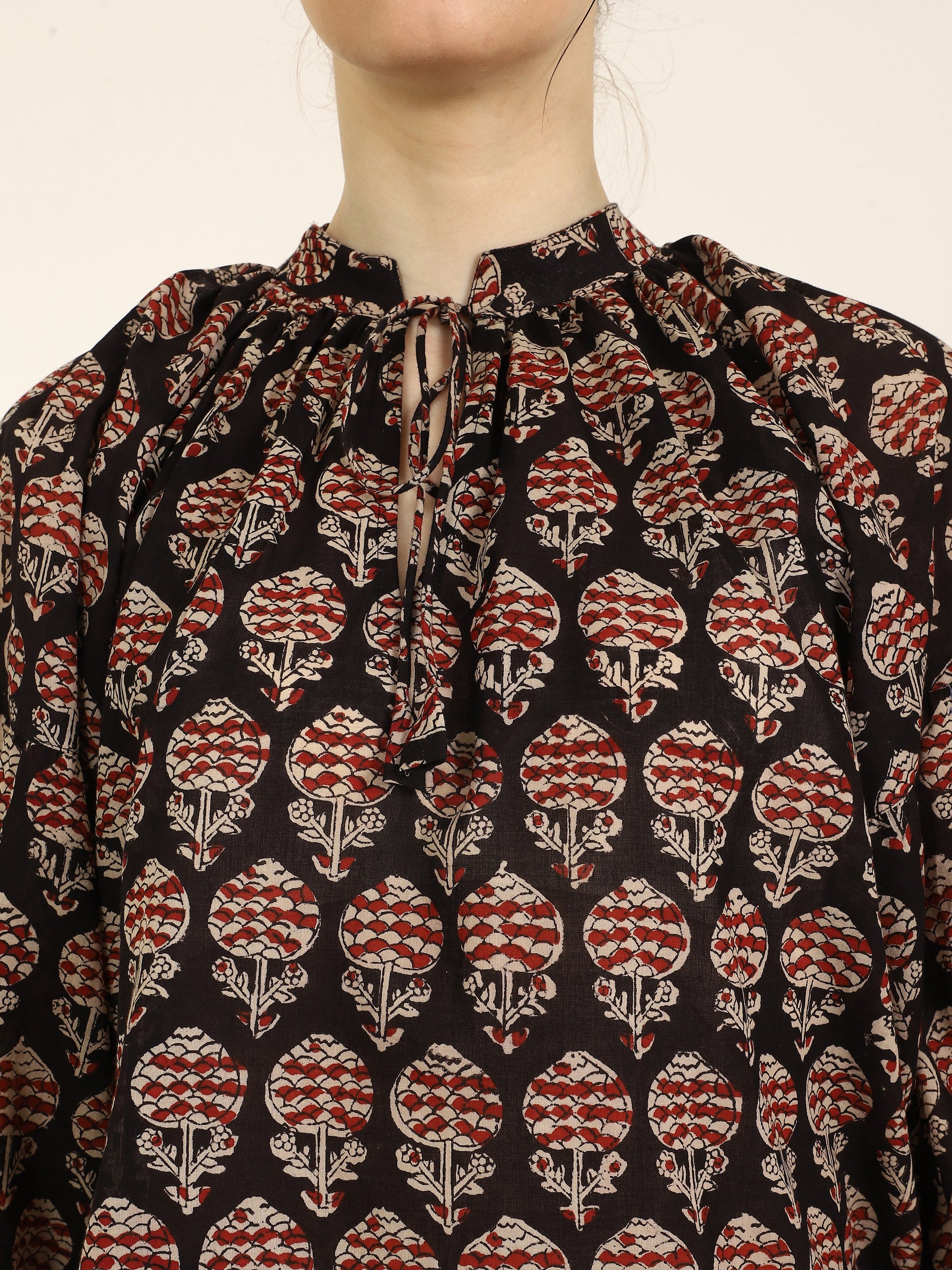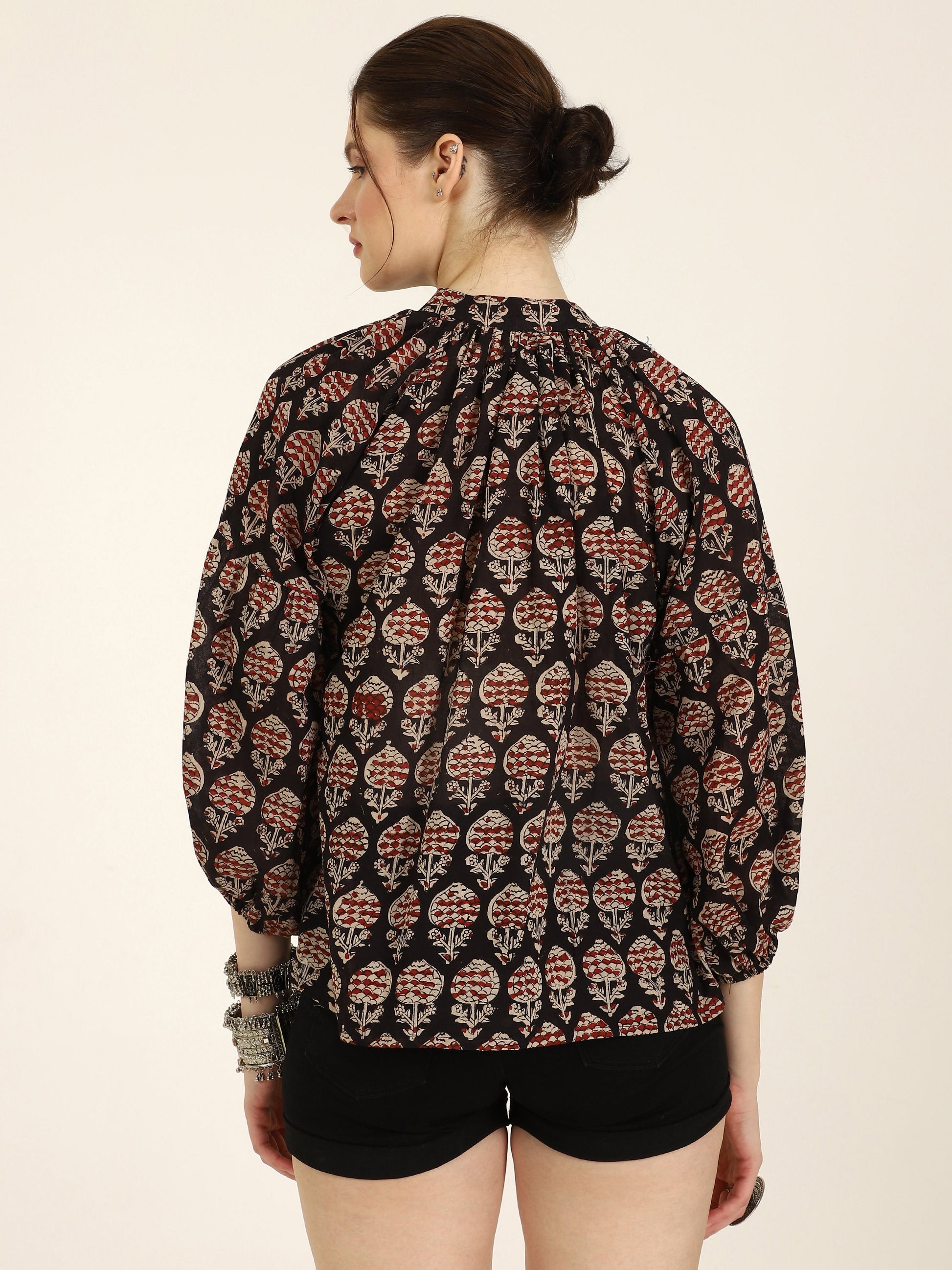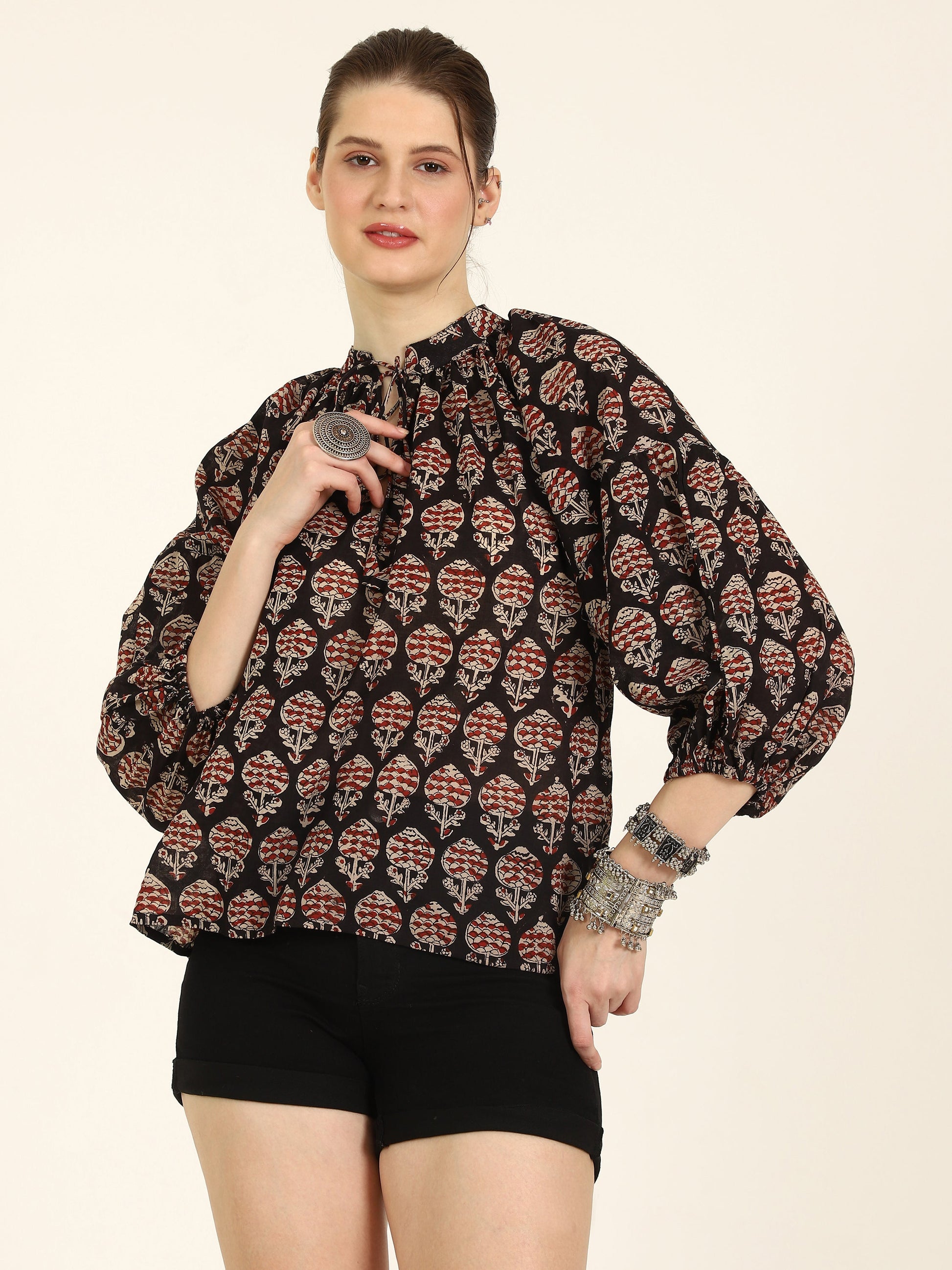 Cotton; Hand block print; summer friendly, breathable. comfortable billowing blouse; adjustable gathering at the neckline; baloon sleeves making it part of the current trends